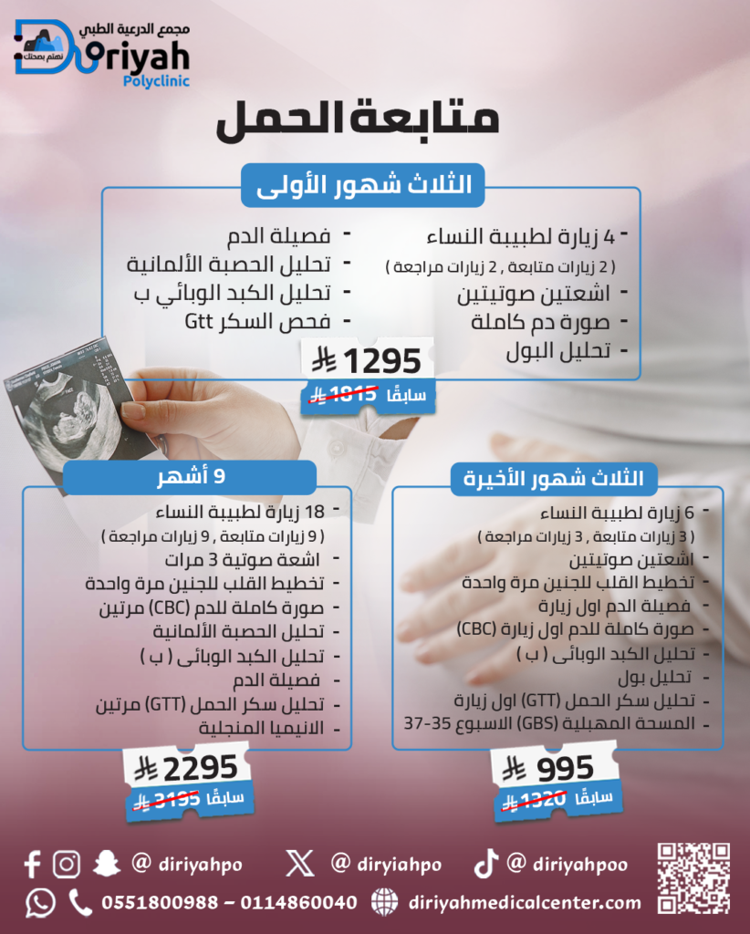 - 6 زيارات لطبيبة النساء (3 زيارات متابعة، 3 زيارات مراجعة)